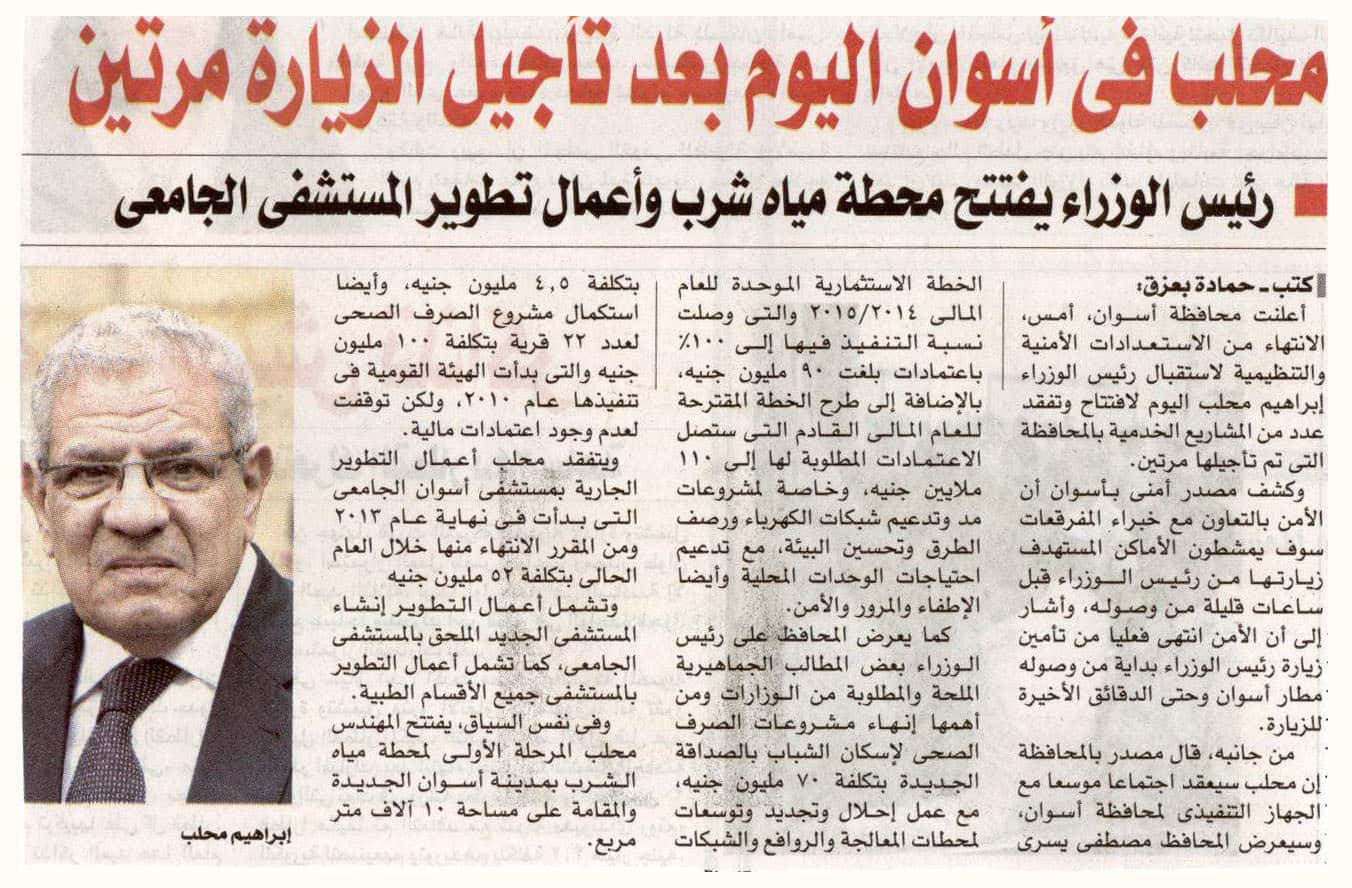 محلب فى أسوان اليوم بعد تأجيل الزيارة مرتين – رئيس الوزراء يفتتح محطة مياه شرب وأعمال تطوير المستشفى الجامعى