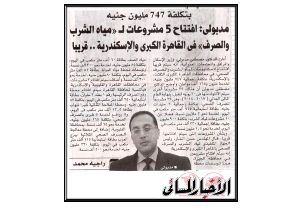 مدبولي :افتتاح 5 مشروعات لـمياه الشرب والصرف في القاهرة الكبرى والاسكندرية …قريباً .