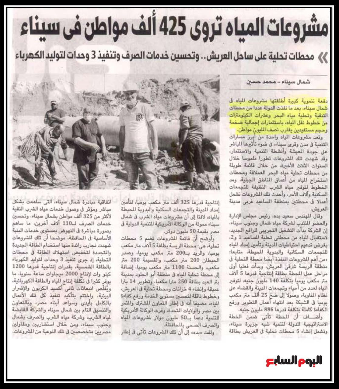 مشروعات المياه تروي 425 ألف مواطن في سيناء .