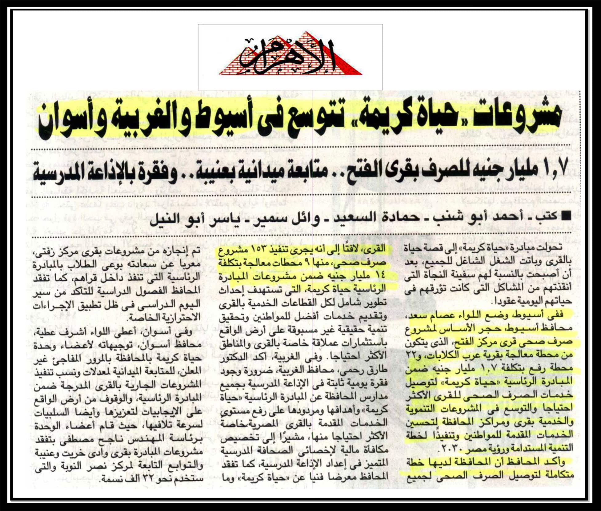 مشروعات حياة كريمة تتوسع في اسيوط والغربية واسوان