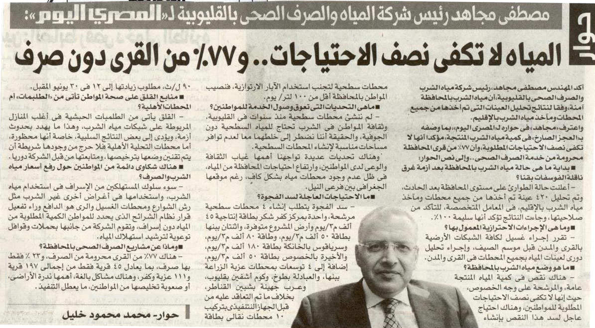 مصطفى مجاهد رئيس شركة المياه و الصرف الصحى بالقليوبية ل ” المصرى اليوم ” : المياه لا تكفى نصف الاحتياجات و 77 % من القرى دون صرف