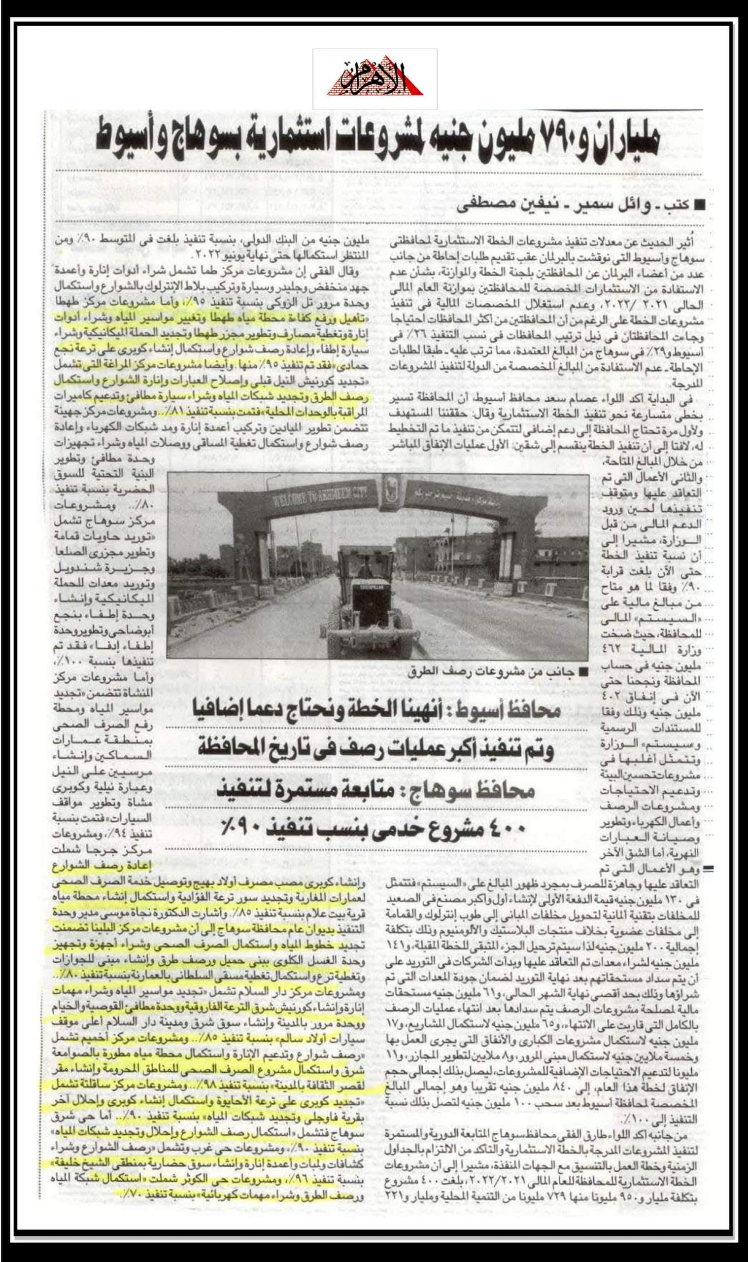 ملياران و790 مليون جنية لمشروعات استثمارية بسوهاج وأسيوط .