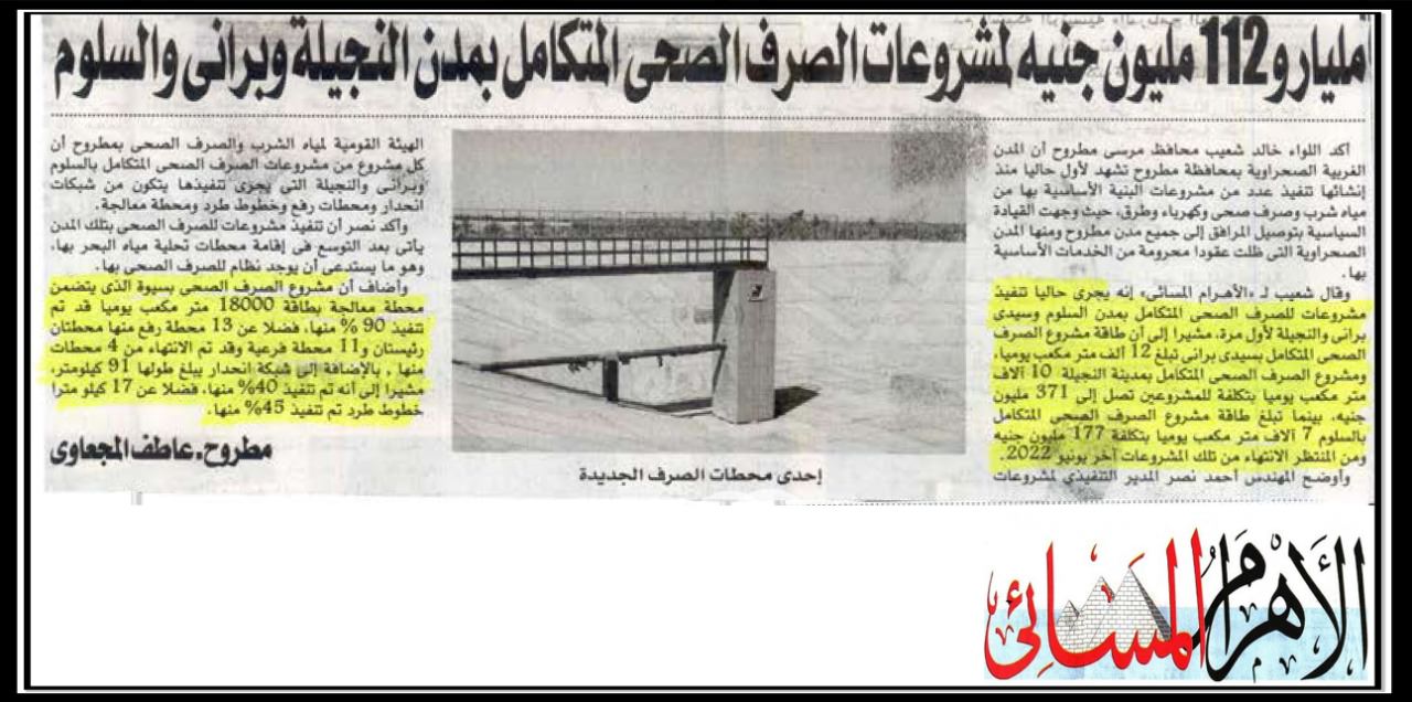 مليار و112 مليون جنية لمشروعات الصرف الصحي المتكامل بمدن النجيلة وبراني والسلوم .