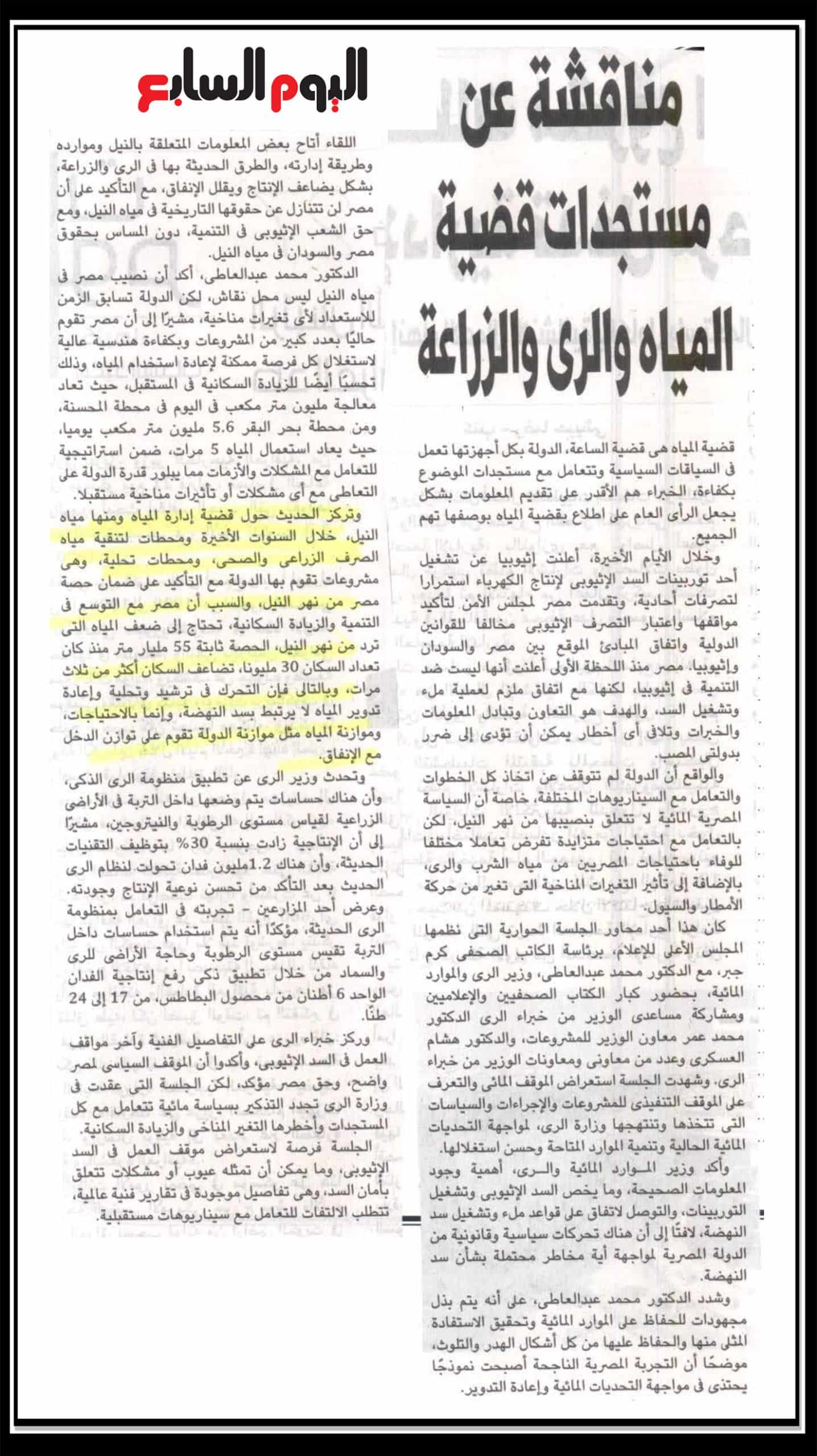 مناقشة عن مستجدات قضية المياه والري والزراعة .