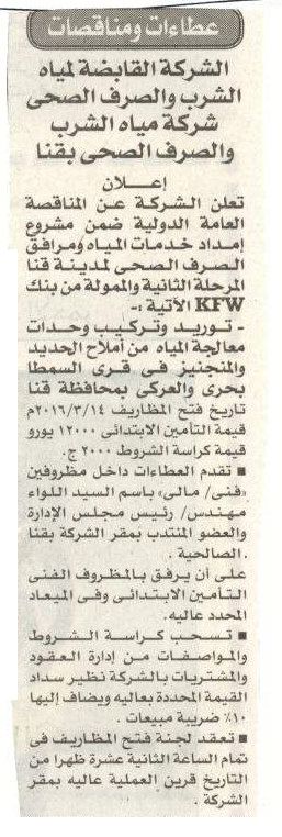 مناقصة: شركة مياه الشرب والصرف الصحي بقنا..2016/1/27 جريدة الاخبار 27/01/2016| Related Posts مناقصة عامة: شركة مياه الشرب والصرف الصحي بالأقصر 01/04/2026 مناقصة عامة: شركة مياه الشرب والصرف الصحي بأسيوط والوادى الجديد 31/03/2026 مناقصة عامة: شركة مياه الشرب والصرف الصحي بمحافظات القناة 31/03/2026 مناقصة عامة: شركة مياه الشرب بالإسكندرية 29/03/2026 مناقصة عامة: شركة مياه الشرب والصرف الصحي بالأقصر 27/03/2026 مناقصة عامة: شركة مياه الشرب والصرف الصحى بمطروح 12/01/2026 مناقصة عامة: شركة مياه الشرب والصرف الصحى بكفر الشيخ 01/01/2026 مناقصة عامة: شركة مياه الشرب والصرف الصحى بمحافظات القناة 01/01/2026
