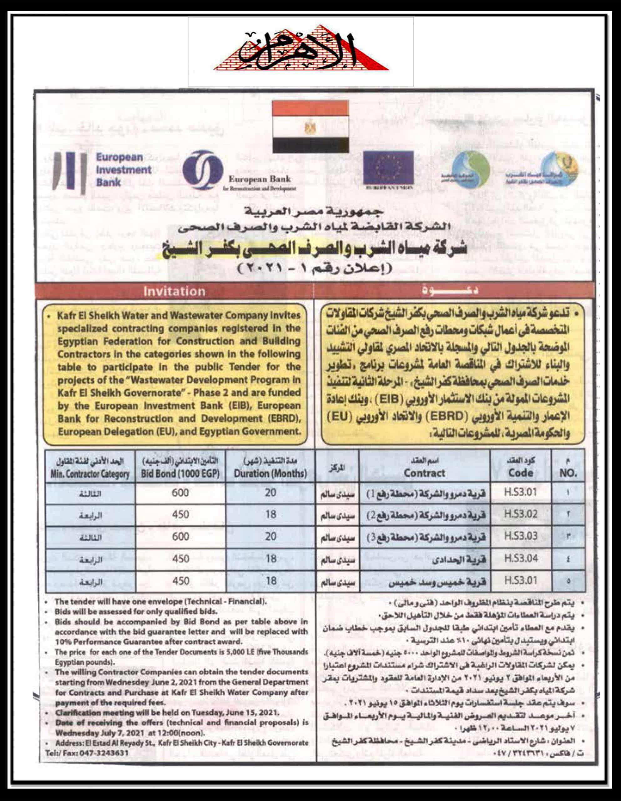 مناقصة عامة: شركة مياه الشرب والصرف الصحي بكفر الشيخ