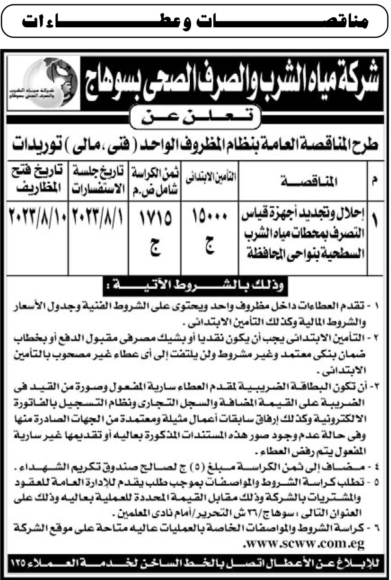 مناقصة عامة : شركة مياه الشرب والصرف الصحي بسوهاج. 20/07/2023|Tags: جريدة الجمهورية| Related Posts مناقصة عامة: شركة مياه الشرب والصرف الصحى بمطروح 12/01/2026 مناقصة عامة: شركة مياه الشرب والصرف الصحى بكفر الشيخ 01/01/2026 مناقصة عامة: شركة مياه الشرب والصرف الصحى بمحافظات القناة 01/01/2026 مناقصة عامة: شركة مياه الشرب والصرف الصحى بالأقصر 24/12/2025 مناقصة عامة: شركة مياه الشرب والصرف الصحى بالشرقية 23/12/2025 مناقصة عامة: شركة مياه الشرب والصرف الصحى بالشرقية 18/12/2025 مناقصة عامة: شركة مياه الشرب والصرف الصحى بالأقصر 10/11/2025 مناقصة عامة: شركة مياه الشرب والصرف الصحى بالمنيا 05/11/2025