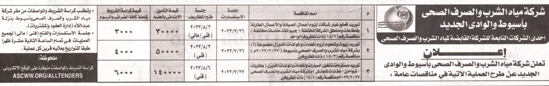 مناقصة عامة : شركة مياه الشرب والصرف الصحي بأسيوط والوادي الجديد. 21/07/2023|Tags: جريدة الاهرام| Related Posts مناقصة عامة: شركة مياه الشرب والصرف الصحى بمطروح 12/01/2026 مناقصة عامة: شركة مياه الشرب والصرف الصحى بكفر الشيخ 01/01/2026 مناقصة عامة: شركة مياه الشرب والصرف الصحى بمحافظات القناة 01/01/2026 مناقصة عامة: شركة مياه الشرب والصرف الصحى بالأقصر 24/12/2025 مناقصة عامة: شركة مياه الشرب والصرف الصحى بالشرقية 23/12/2025 مناقصة عامة: شركة مياه الشرب والصرف الصحى بالشرقية 18/12/2025 مناقصة عامة: شركة مياه الشرب والصرف الصحى بالأقصر 10/11/2025 مناقصة عامة: شركة مياه الشرب والصرف الصحى بالمنيا 05/11/2025