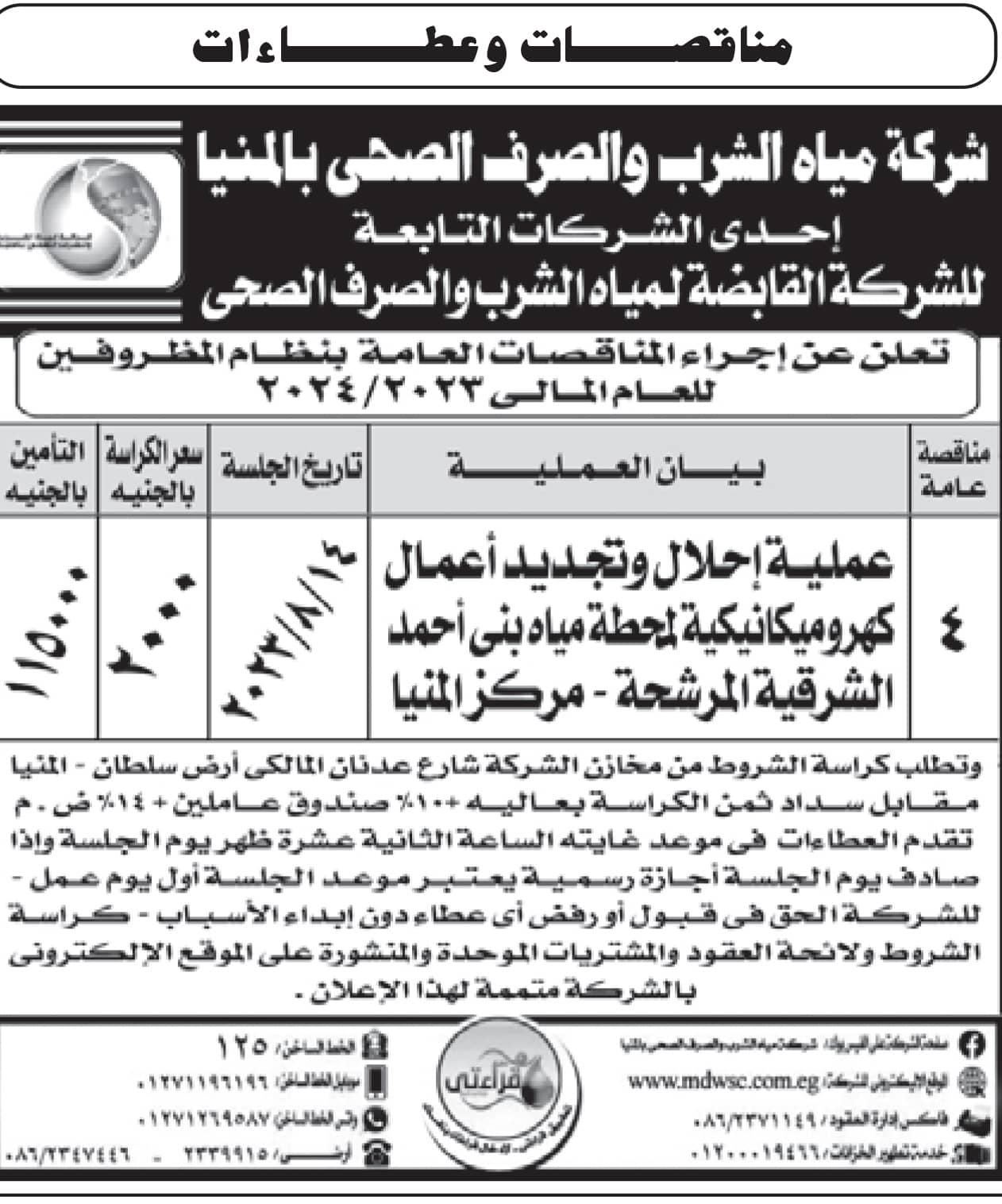مناقصة عامة : شركة مياه الشرب والصرف الصحي بالمنيا. 28/07/2023|Tags: جريدة الجمهورية| Related Posts مناقصة عامة: شركة مياه الشرب والصرف الصحى بمطروح 12/01/2026 مناقصة عامة: شركة مياه الشرب والصرف الصحى بكفر الشيخ 01/01/2026 مناقصة عامة: شركة مياه الشرب والصرف الصحى بمحافظات القناة 01/01/2026 مناقصة عامة: شركة مياه الشرب والصرف الصحى بالأقصر 24/12/2025 مناقصة عامة: شركة مياه الشرب والصرف الصحى بالشرقية 23/12/2025 مناقصة عامة: شركة مياه الشرب والصرف الصحى بالشرقية 18/12/2025 مناقصة عامة: شركة مياه الشرب والصرف الصحى بالأقصر 10/11/2025 مناقصة عامة: شركة مياه الشرب والصرف الصحى بالمنيا 05/11/2025