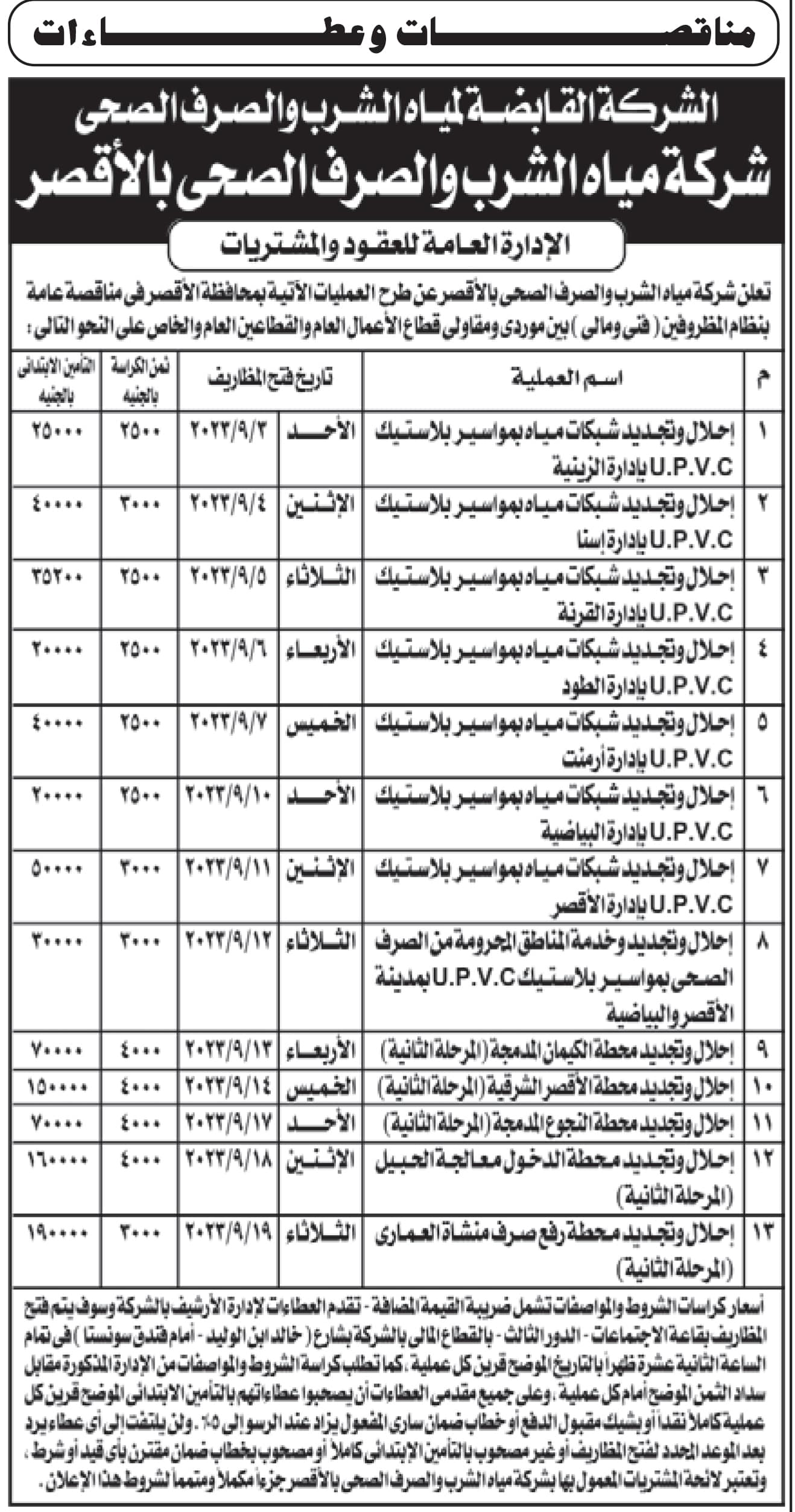 مناقصة عامة : شركة مياه الشرب والصرف الصحي بالاقصر. 18/08/2023|Tags: جريدة الجمهورية| Related Posts مناقصة عامة: شركة مياه الشرب والصرف الصحى بمطروح 12/01/2026 مناقصة عامة: شركة مياه الشرب والصرف الصحى بكفر الشيخ 01/01/2026 مناقصة عامة: شركة مياه الشرب والصرف الصحى بمحافظات القناة 01/01/2026 مناقصة عامة: شركة مياه الشرب والصرف الصحى بالأقصر 24/12/2025 مناقصة عامة: شركة مياه الشرب والصرف الصحى بالشرقية 23/12/2025 مناقصة عامة: شركة مياه الشرب والصرف الصحى بالشرقية 18/12/2025 مناقصة عامة: شركة مياه الشرب والصرف الصحى بالأقصر 10/11/2025 مناقصة عامة: شركة مياه الشرب والصرف الصحى بالمنيا 05/11/2025