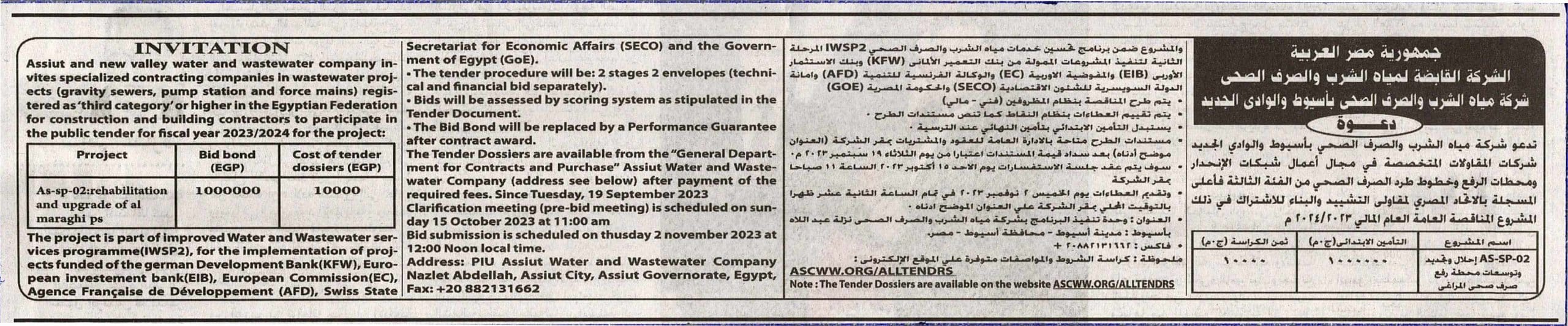 مناقصة عامة: شركة مياه الشرب والصرف الصحي بأسيوط والوادي الجديد. 19/09/2023| Related Posts مناقصة عامة: شركة مياه الشرب والصرف الصحى بمطروح 12/01/2026 مناقصة عامة: شركة مياه الشرب والصرف الصحى بكفر الشيخ 01/01/2026 مناقصة عامة: شركة مياه الشرب والصرف الصحى بمحافظات القناة 01/01/2026 مناقصة عامة: شركة مياه الشرب والصرف الصحى بالأقصر 24/12/2025 مناقصة عامة: شركة مياه الشرب والصرف الصحى بالشرقية 23/12/2025 مناقصة عامة: شركة مياه الشرب والصرف الصحى بالشرقية 18/12/2025 مناقصة عامة: شركة مياه الشرب والصرف الصحى بالأقصر 10/11/2025 مناقصة عامة: شركة مياه الشرب والصرف الصحى بالمنيا 05/11/2025