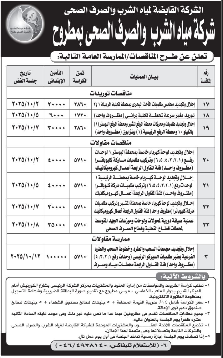 مناقصة عامة: شركة مياه الشرب والصرف الصحى بمطروح 17/09/2025|الوسوم: جريدة الأخبار, جريدة الأهرام| منشورات متعلقة مناقصة عامة: شركة مياه الشرب بالإسكندرية 02/10/2025 مناقصة عامة: شركة مياه الشرب والصرف الصحى بالأقصر 28/09/2025 مناقصة عامة: شركة مياه الشرب والصرف الصحى بالشرقية 15/09/2025 مناقصة عامة: شركة مياه الشرب بالإسكندرية 31/08/2025 مناقصة عامة: شركة مياه الشرب بالإسكندرية 03/08/2025 مناقصة عامة: شركة مياه الشرب بالإسكندرية 11/06/2025 مناقصة عامة: شركة مياه الشرب والصرف الصحى بالأقصر 04/06/2025 مناقصة عامة: شركة مياه الشرب والصرف الصحى بالشرقية 25/05/2025