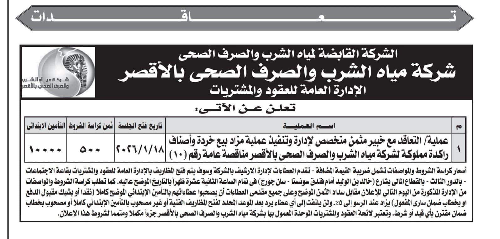 مناقصة عامة: شركة مياه الشرب والصرف الصحى بالأقصر 24/12/2025| منشورات متعلقة مناقصة عامة: شركة مياه الشرب والصرف الصحى بالشرقية 23/12/2025 مناقصة عامة: شركة مياه الشرب والصرف الصحى بالشرقية 18/12/2025 مناقصة عامة: شركة مياه الشرب والصرف الصحى بالأقصر 10/11/2025 مناقصة عامة: شركة مياه الشرب والصرف الصحى بالمنيا 05/11/2025 مناقصة عامة: شركة مياه الشرب بالإسكندرية 02/10/2025 مناقصة عامة: شركة مياه الشرب والصرف الصحى بالأقصر 28/09/2025 مناقصة عامة: شركة مياه الشرب والصرف الصحى بمطروح 17/09/2025 مناقصة عامة: شركة مياه الشرب والصرف الصحى بالشرقية 15/09/2025