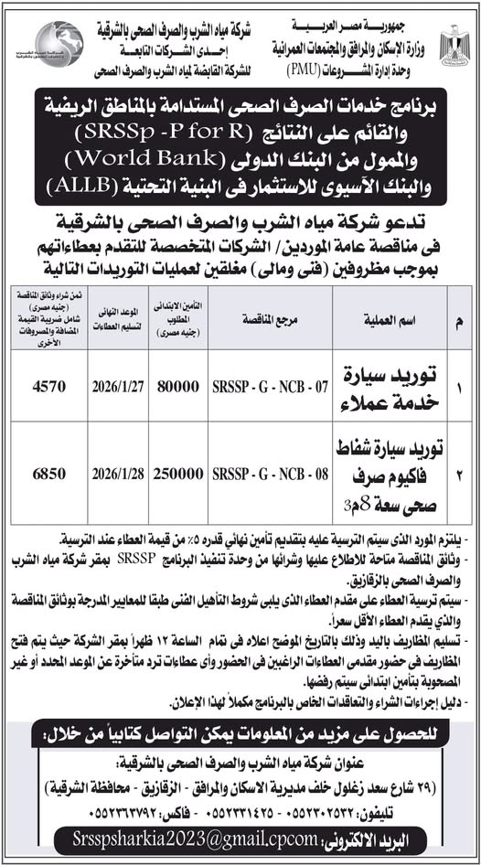 مناقصة عامة: شركة مياه الشرب والصرف الصحى بالشرقية 23/12/2025|الوسوم: جريدة الأخبار| منشورات متعلقة مناقصة عامة: شركة مياه الشرب والصرف الصحى بالأقصر 24/12/2025 مناقصة عامة: شركة مياه الشرب والصرف الصحى بالشرقية 18/12/2025 مناقصة عامة: شركة مياه الشرب والصرف الصحى بالأقصر 10/11/2025 مناقصة عامة: شركة مياه الشرب والصرف الصحى بالمنيا 05/11/2025 مناقصة عامة: شركة مياه الشرب بالإسكندرية 02/10/2025 مناقصة عامة: شركة مياه الشرب والصرف الصحى بالأقصر 28/09/2025 مناقصة عامة: شركة مياه الشرب والصرف الصحى بمطروح 17/09/2025 مناقصة عامة: شركة مياه الشرب والصرف الصحى بالشرقية 15/09/2025
