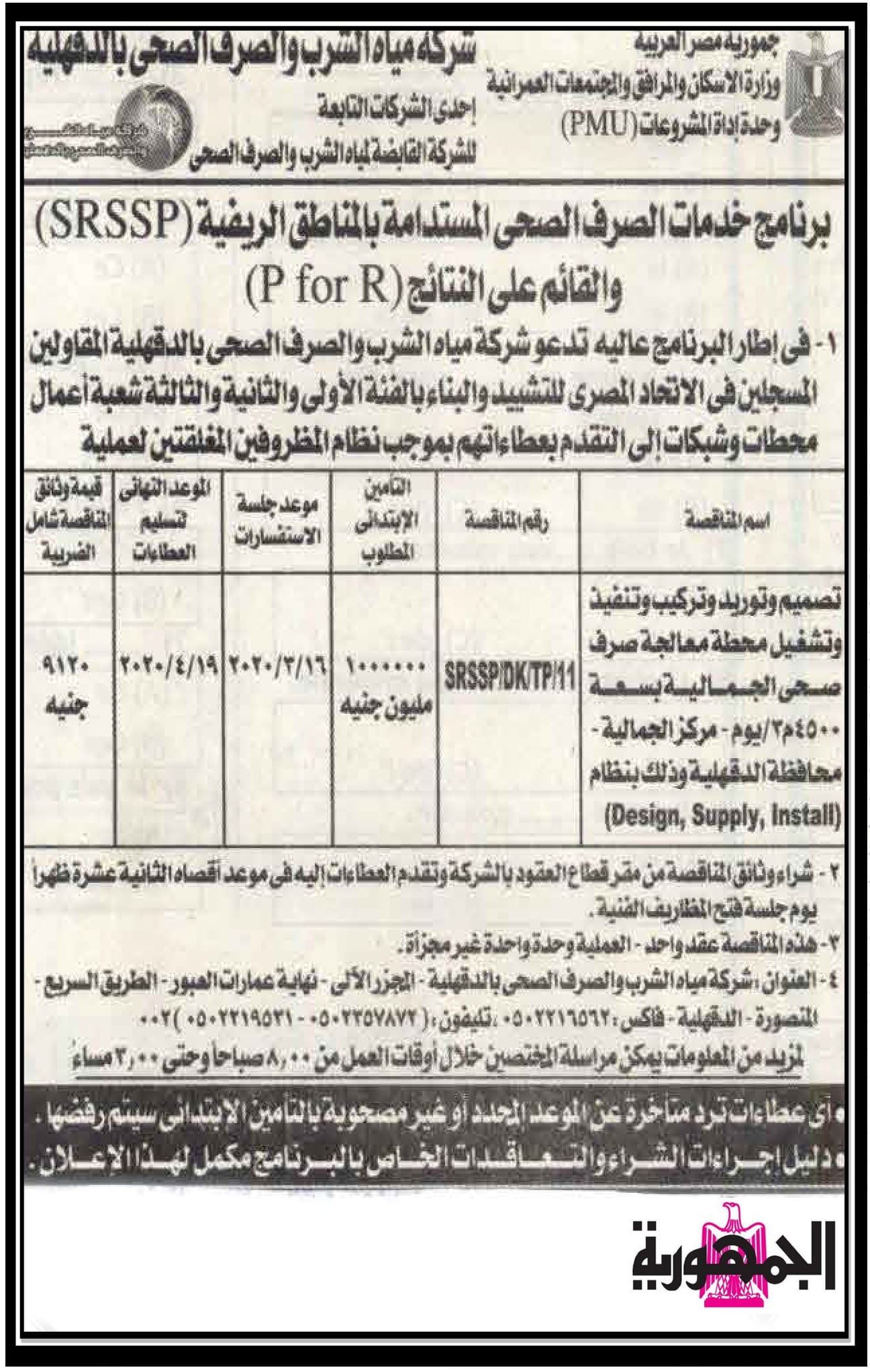 مناقصة عامة : ” شركة مياه الشرب والصرف الصحي بالدقهلية “ 27/02/2020|Tags: جريدة الجمهورية| Related Posts مناقصة عامة: شركة مياه الشرب والصرف الصحى بمطروح 12/01/2026 مناقصة عامة: شركة مياه الشرب والصرف الصحى بكفر الشيخ 01/01/2026 مناقصة عامة: شركة مياه الشرب والصرف الصحى بمحافظات القناة 01/01/2026 مناقصة عامة: شركة مياه الشرب والصرف الصحى بالأقصر 24/12/2025 مناقصة عامة: شركة مياه الشرب والصرف الصحى بالشرقية 23/12/2025 مناقصة عامة: شركة مياه الشرب والصرف الصحى بالشرقية 18/12/2025 مناقصة عامة: شركة مياه الشرب والصرف الصحى بالأقصر 10/11/2025 مناقصة عامة: شركة مياه الشرب والصرف الصحى بالمنيا 05/11/2025