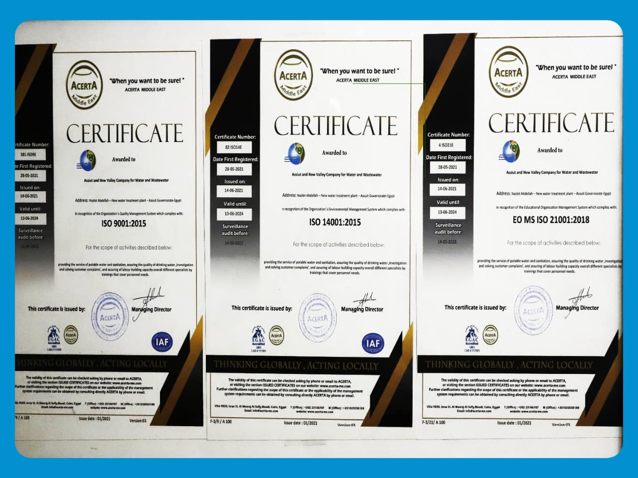 منظمةISO الدولية تمنح مياه أسيوط 3 شهادات للجودة لقطاع المعامل ومركز خدمة عملاء