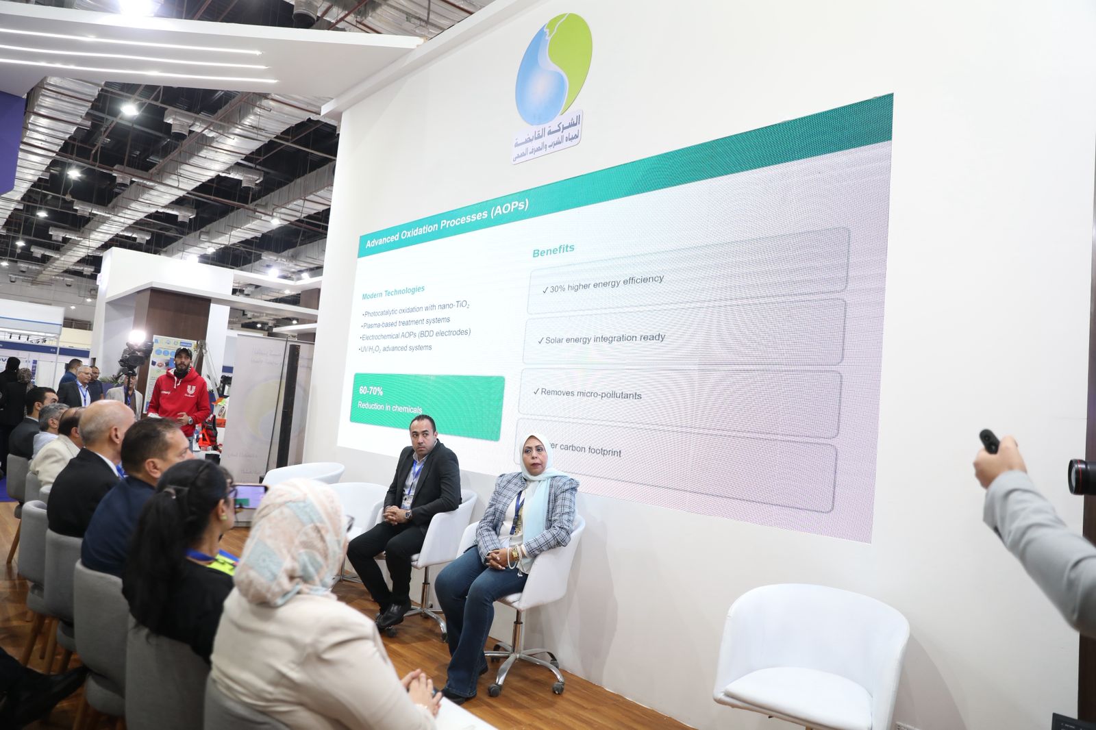 واختُتمت الجلسة بعرض قدّمه الدكتور أحمد جمال، مدير الشؤون البيئية بالشركة القابضة، حولوالتأثيرات المحتملة للتغيرات المناخية في قطاع مياه الشرب والصرف الصحى وطرق مواجهتها كما تطرق الي خارطة طريق مسار التحول نحو مرافق أكثر كفاءة واستدامة وبناء استراتيجية وطنية لمرافق منخفضة الانبعاثات الكربونية.