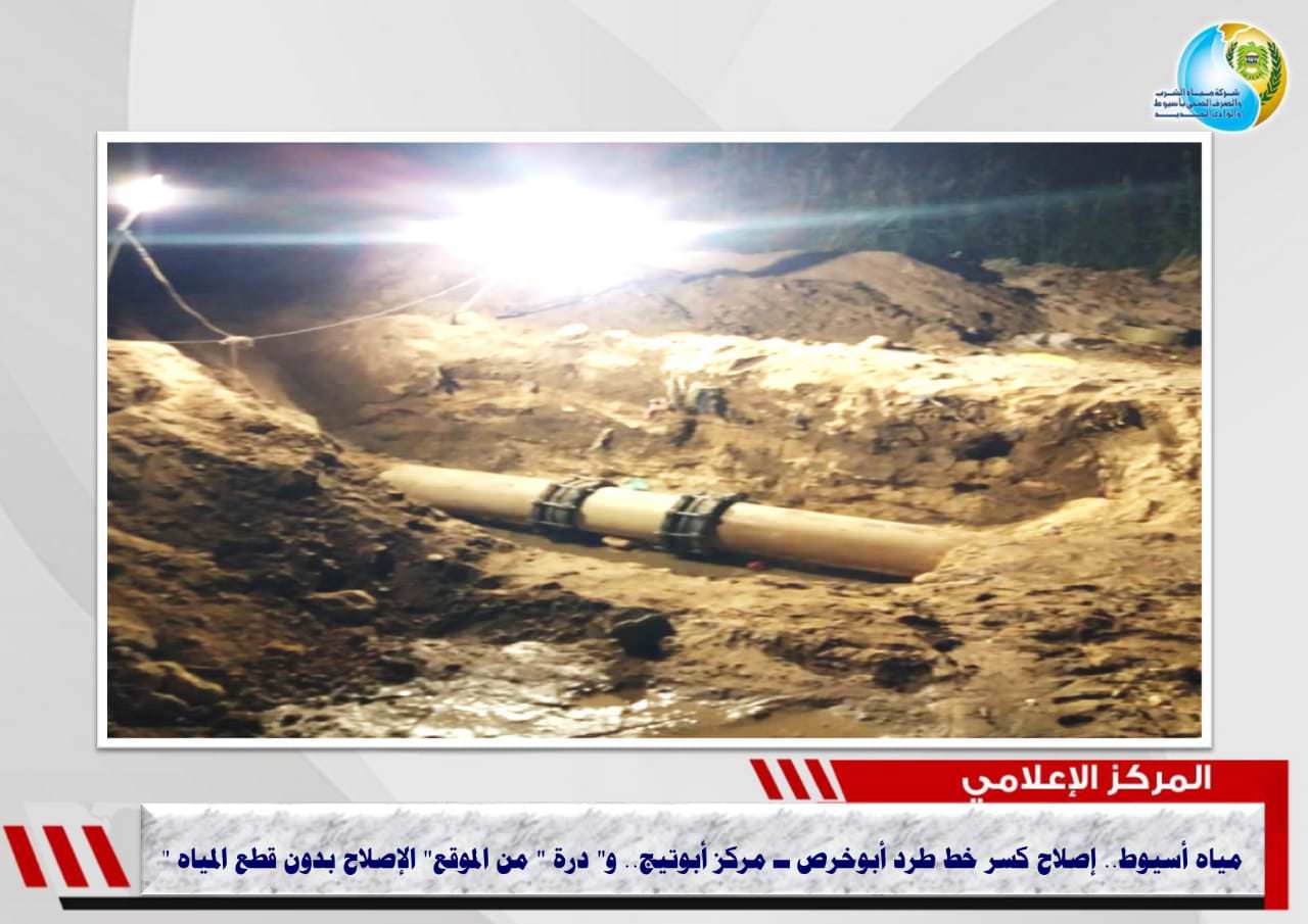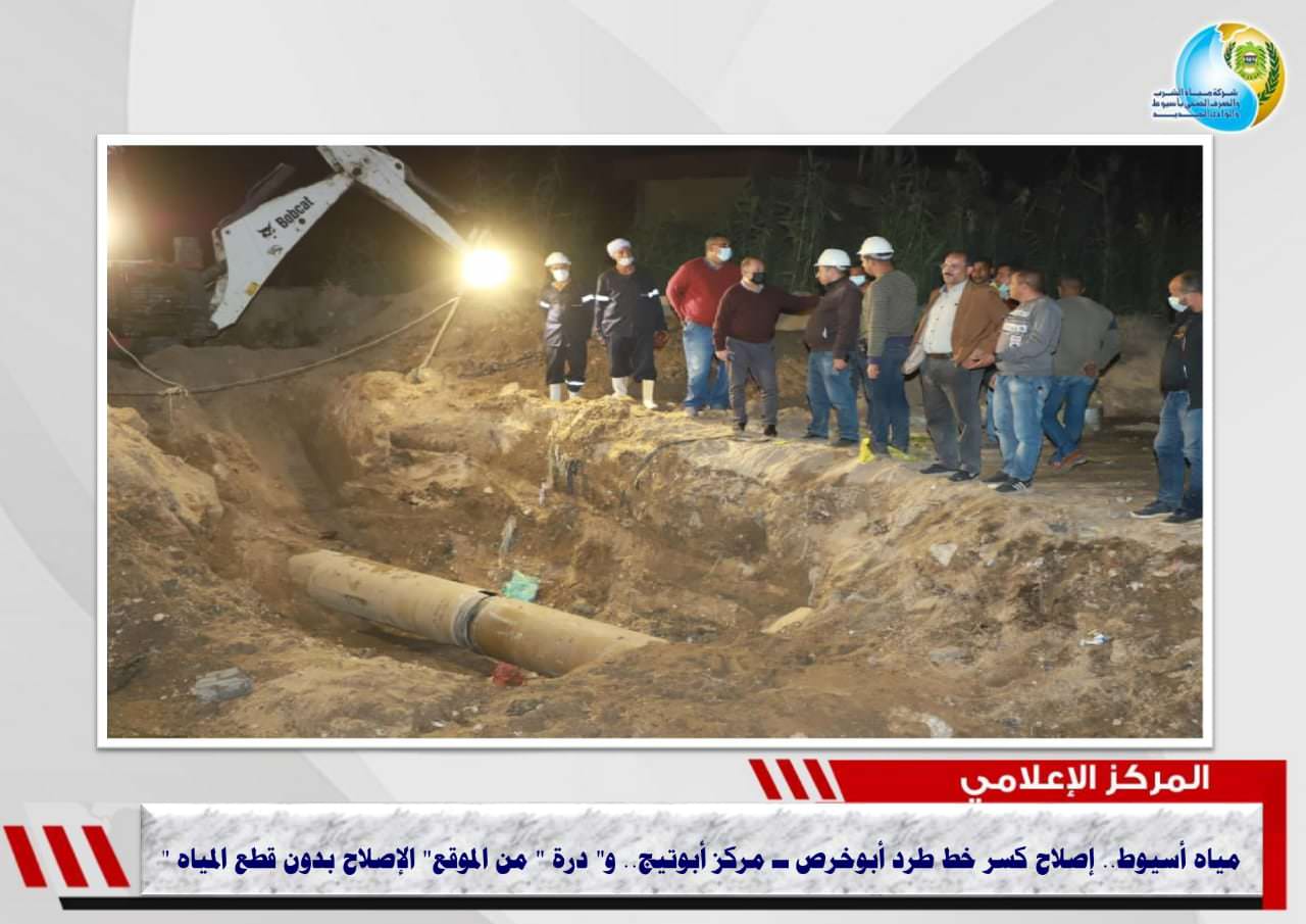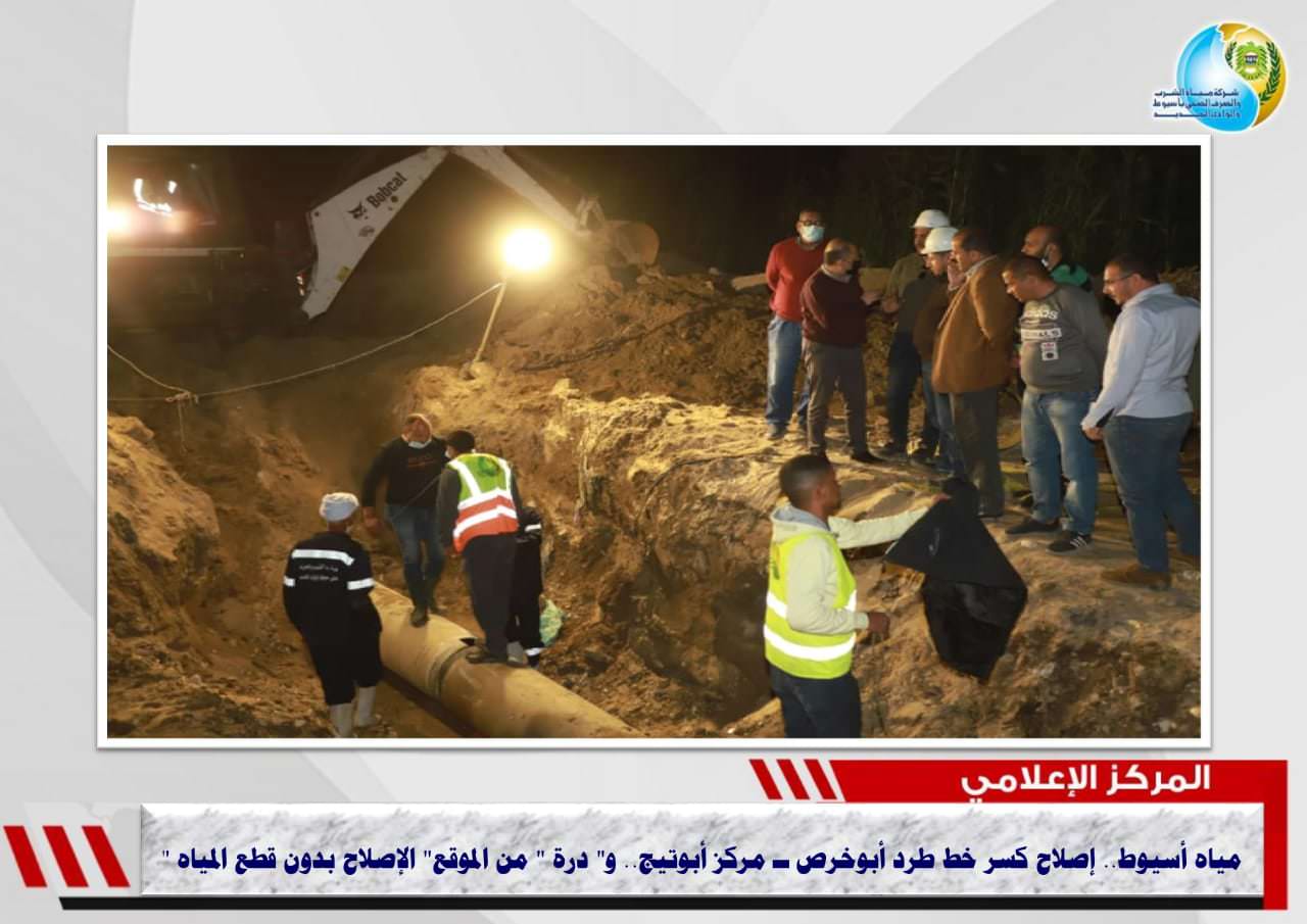 و تابع اللواء أركان حرب المهندس هشام درة ، رئيس مجلس الإدارة والعضو المنتدب لشركة مياه الشرب والصرف الصحي بأسيوط والوادى الجديد، على الطبيعة أعمال الاصلاح ، مشدداً على أهمية التعامل مع الموقف بكل دقه وسرعة.