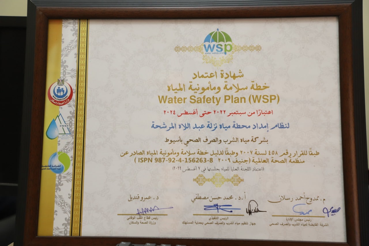 مياه أسيوط: اعتماد شهادة سلامة ومأمونية المياه لنظام إمداد محطة نزلة عبداللاه المرشحة.