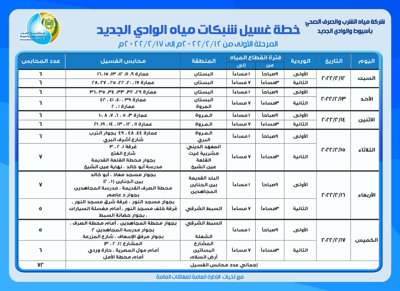 وأضاف الكيميائي إسلام حسنين رئيس قطاع المعامل وضبط الجودة بالشركة أن خطة غسيل الشبكات بمدينة الخاارجة بمحافظة الوادى الجديد يبدأ تفعيلها لعدد (72) محبس غسيل بعدد (15) منطقة بالمدينة كمرحلة أولي على أن يتم توقيع إحداثيات محابس الغسيل على برنامج GIS.