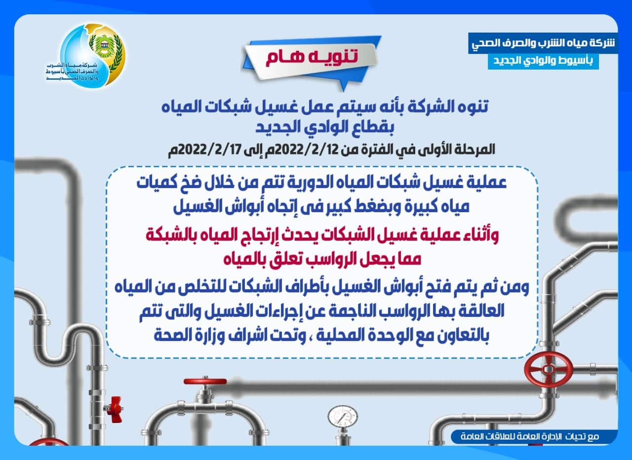 و تنوه الشركة على السادة المواطنين أنه فى حالة وجود أى رواسب عالقة بالمياه خلال الأوقات القليلة القادمة بعد إجراء أعمال غسيل الشبكات، يتم تشغيل المياه بعض الوقت للتخلص من تلك الرواسب .