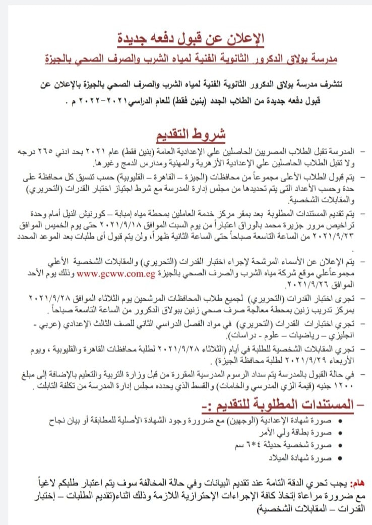 وأعلنت شركة مياه الشرب والصرف الصحي بالجيزة، عن فتح باب التقديم للقبول فى المدرسة الفنية للعام الدراسي ۲۰٢١-۲۰۲۲ م، على أن تتوافر الشروط التالية: (المدرسة تقبل الطلاب المصريين الحاصلين على الإعدادية العامة لعام ٢٠٢١ بحد ادني ٢٦٥ درجه – يتم قبول الطلاب الأعلى مجموعاً من محافظات (الجيزة – القاهرة – القليوبية) حسب تنسيق كل محافظة على حدة وحسب الأعداد التي يتم تحديدها من مجلس إدارة المدرسة مع شرط اجتياز اختبار القدرات (التحريري) والمقابلات الشخصية – يتم تقديم المستندات المطلوبة بمقر مركز خدمة العاملين بمحطة مياه إمبابة كورنيش النيل اعتباراً من يوم السبت الموافق ۲۰۲۱/۹/۱۸ حتى يوم الخميس الموافق ۲۰۲۱/۹/۲۳ من الساعة التاسعة صباحا حتى الساعة الثانية ظهراً، ولن يتم قبول أي طلبات بعد الموعد المحدد – يتم الإعلان عن الأسماء المرشحة لإجراء اختبار القدرات (التحريري) والمقابلات الشخصية الأعلي مجموعا علي موقع شركة مياه الشرب والصرف الصحي بالجيزة www.gcww.com.eg وذلك يوم الأحد الموافق ۲۰۲۱/۹/٢٦).