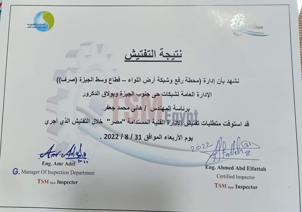 مياه الشرب بالجيزة.. حصول محطة رفع وشبكة صرف صحي أرض اللواء بالجيزة على شهادة الإدارة الفنية المستدامة TSM