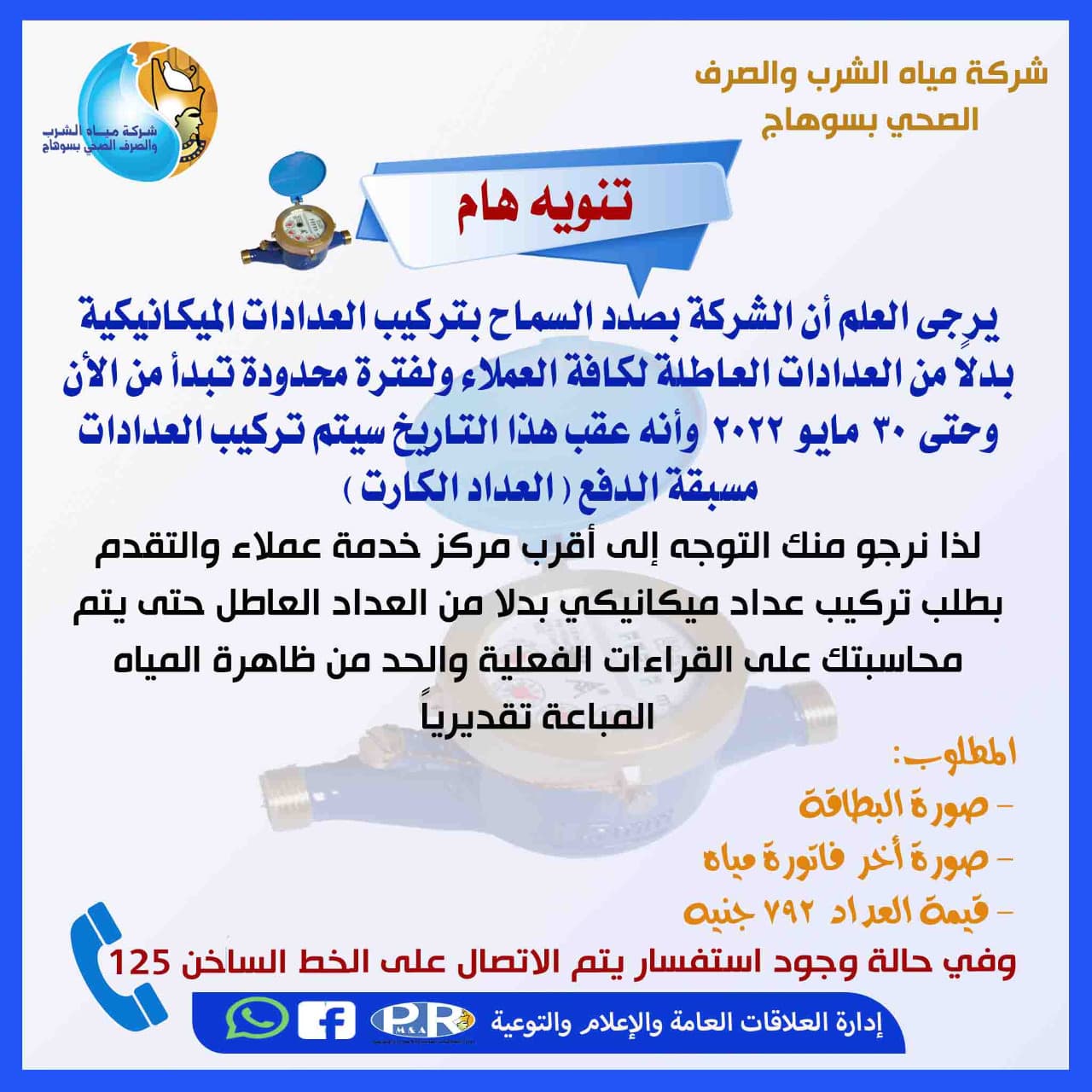 مياه سوهاج تناشد العملاء اصحاب العدادات العاطلة بسرعة تغيير العدادات قبل نهاية مايو الجارى