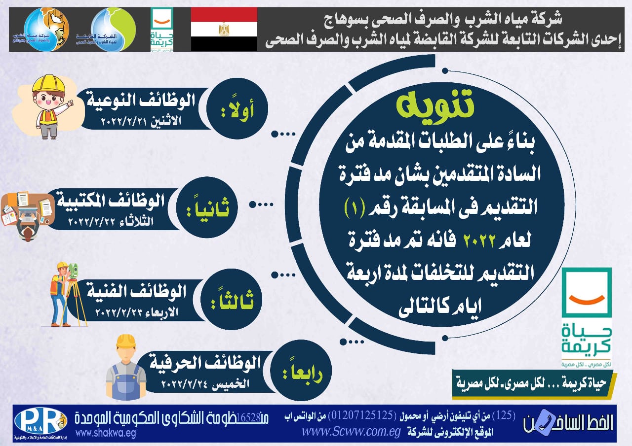 مياه سوهاج: مد فترة التقديم لمسابقة التوظيف رقم 1 لعام 2022 لمدة اربعة ايام