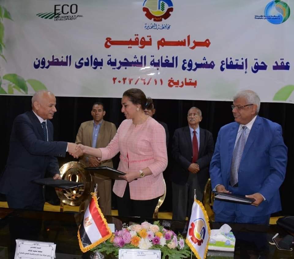 شهدت الدكتورة نهال بلبع، نائب محافظ البحيرة، وكلا من الدكتور محمد حسن رئيس الجهاز التنظيمى لمياه الشرب والصرف الصحى وحماية المستهلك، والمهندس محمد سعيد نشأت رئيس شركة مياه الشرب والصرف الصحى بالبحيرة، مراسم توقيع عقد حق إنتفاع مشروع إقامة غابة شجرية بوادى النطرون، بين كلا من محافظة البحيرة وشركة مياه البحيرة وشركة إيكو EKHO للتنمية الزراعية بتكلفة إستثمارية ٣٠ مليون جنيه، فى إطار خطة التنمية للمحافظة، ودعم الإقتصاد الوطني وتحسين البيئة.