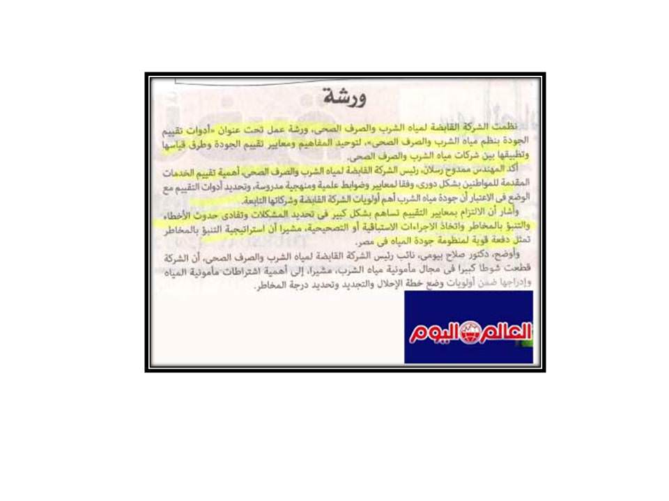 ورشة عمل بعنوان “أدوات تقييم الجودة بنظم مياه الشرب والصرف الصحى”