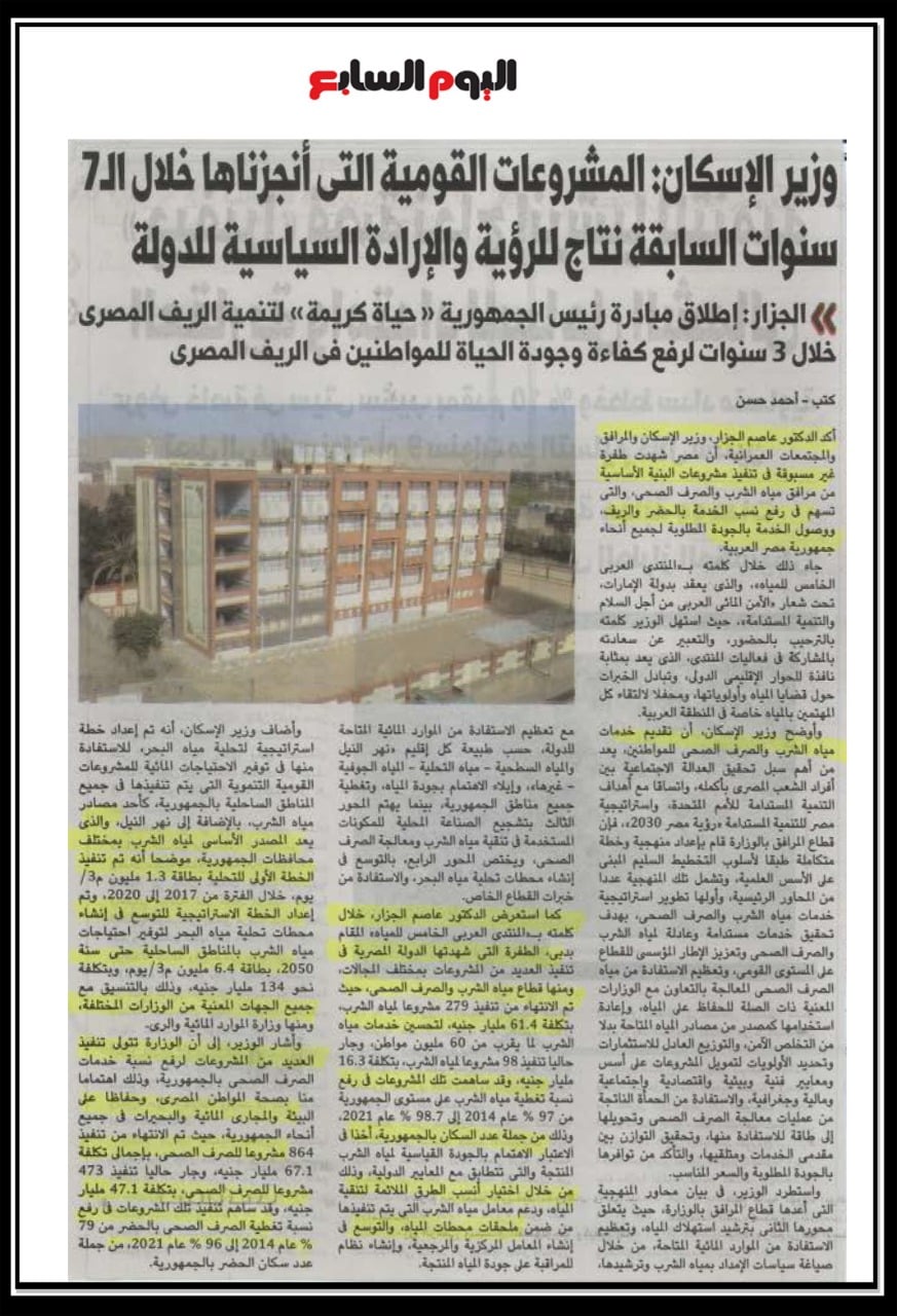 وزير الاسكان: المشروعات القومية التي انجزناها خلال ال7 سنوات السابقة نتاج للرؤية والادارة السياسية للدولة