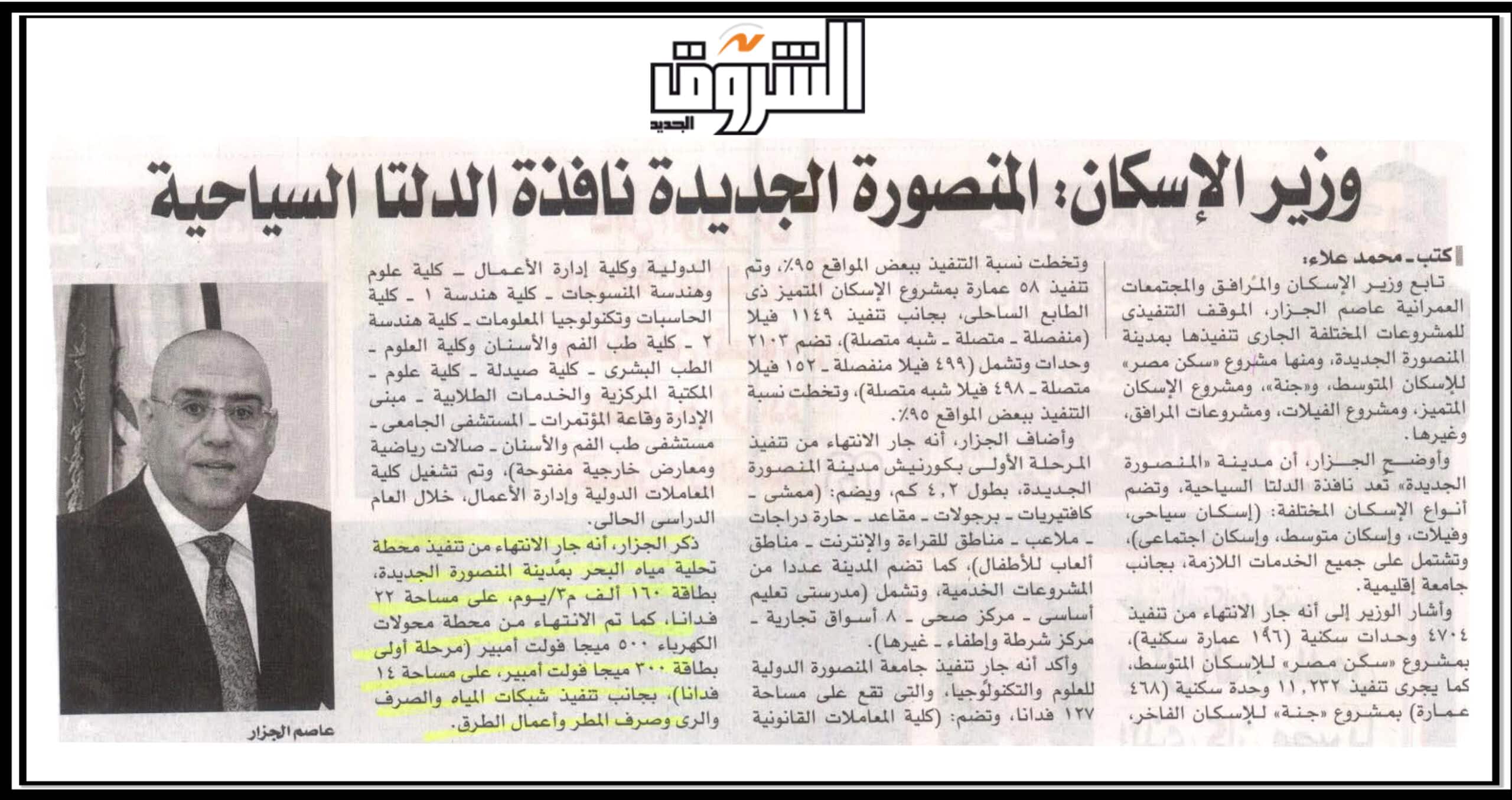 وزير الاسكان : المنصورة الجديدة نافذة الدلتا السياحية .