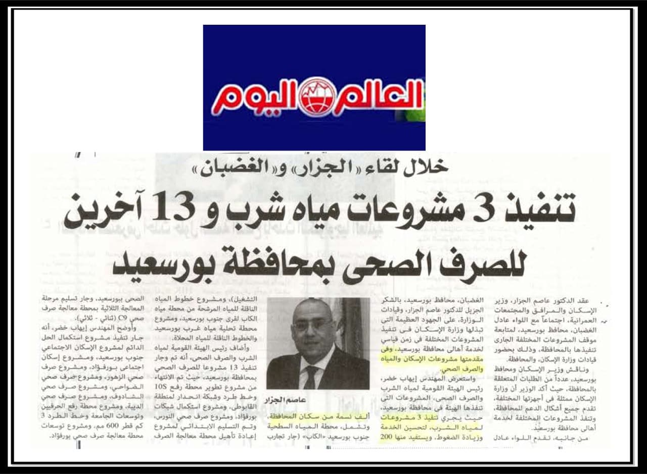 وزير الاسكان : تنفيذ 3 مشروعات مياه شرب و13 اخرين للصرف الصحي بمحافظة بور سعيد .