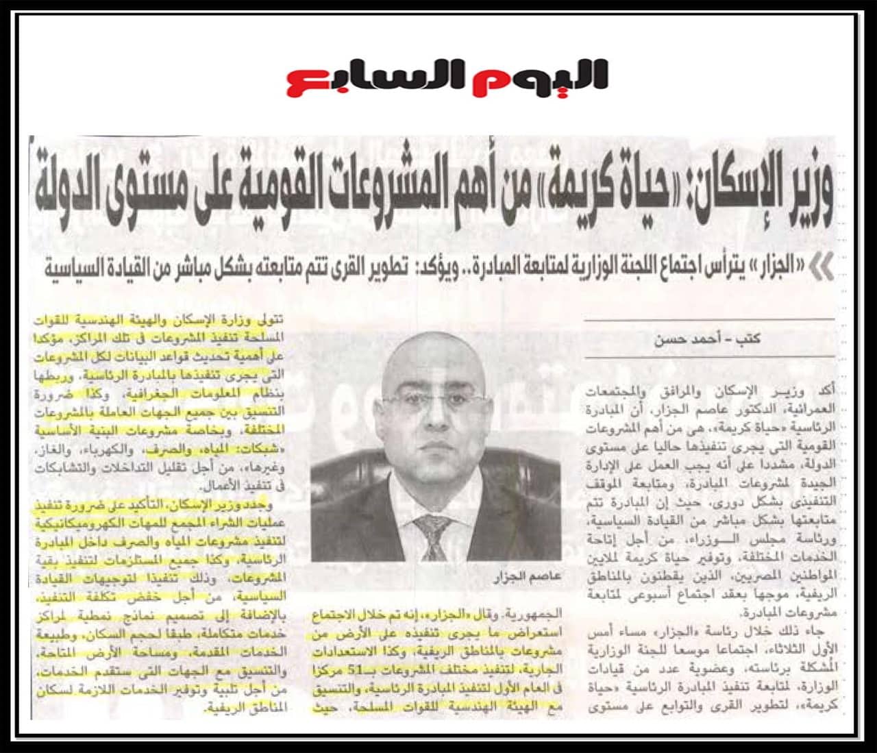 وزير الاسكان : حياة كريمة من أهم المشروعات القومية على مستوى الدولة .