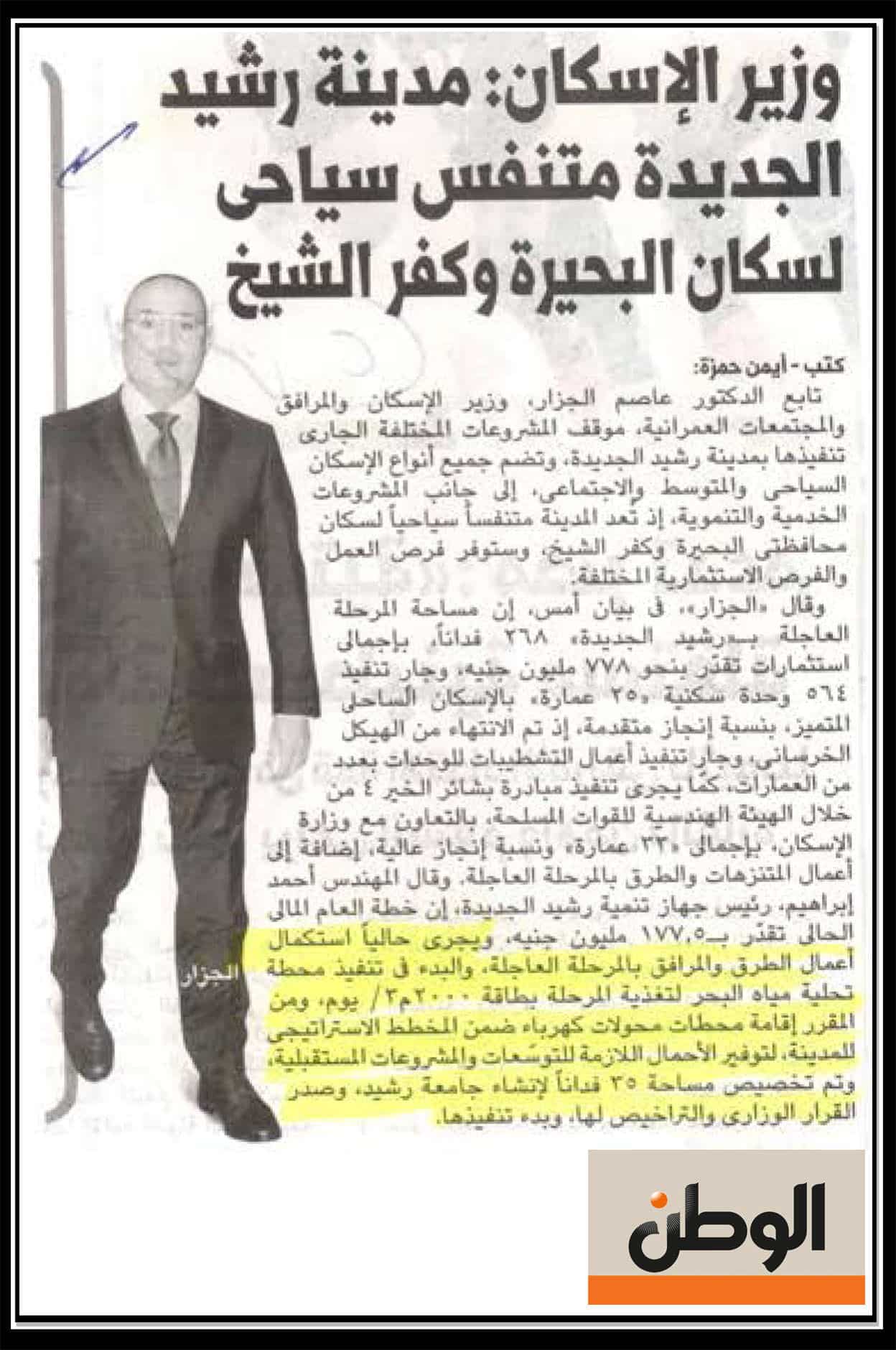 وزير الاسكان : مدينة رشيد الجديدة متنفس سياحي لسكان البحيرة وكفر الشيخ .