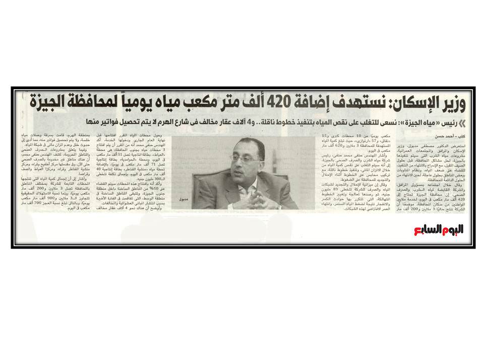 وزير الاسكان : نستهدف اضافة 420 الف متر مكعب مياه يوميا لمحافظة الجيزة …
