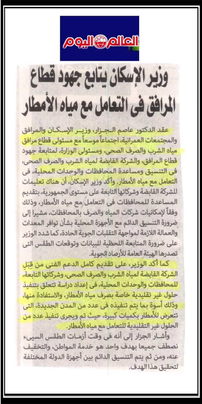 وزير الاسكان يتابع جهود قطاع المرافق في التعامل مع مياه الامطار