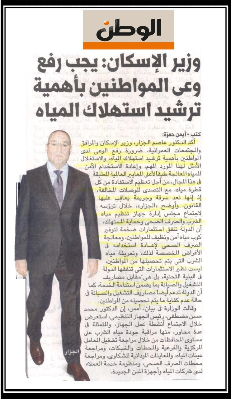 وزير الاسكان: يجب رفع وعي المواطنين باهمية ترشيد استهلاك المياه