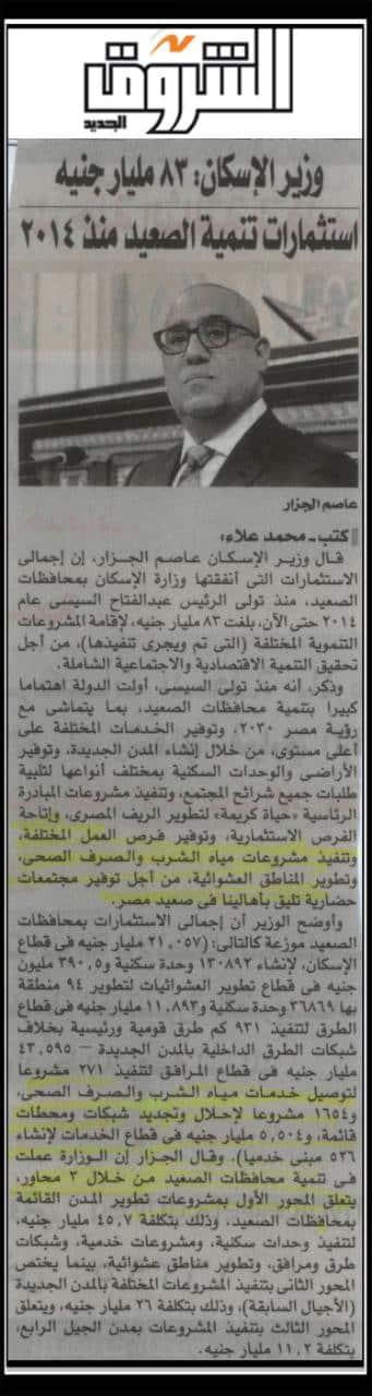 وزير الاسكان: ٨٣ مليار جنية استثمارات تنمية الصعيد منذ عام ٢٠١٤