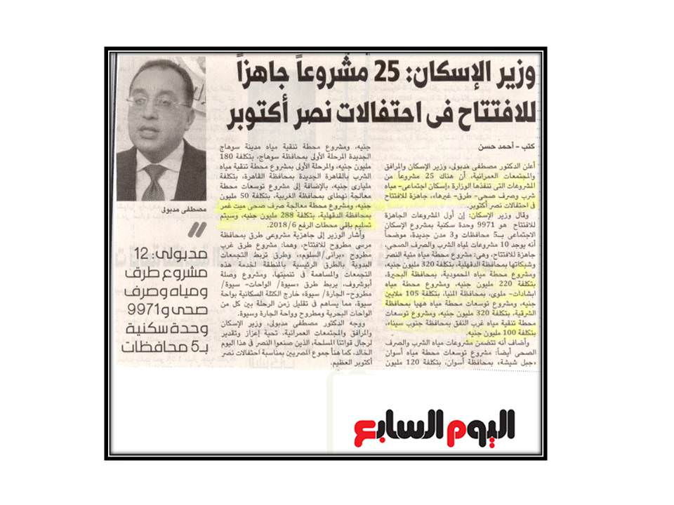 وزير الاسكان : 25 مشروعا جاهزا للافتتاح في احتفالات نصر اكتوبر .