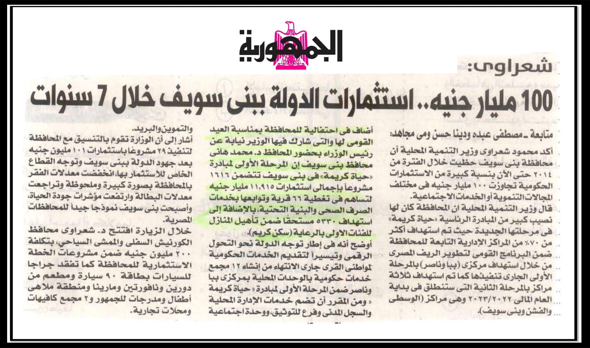 وزير التنمية المحلية : 100 مليار جنية … استثمارات الدولة ببني سويف خلال 7 سنوات .