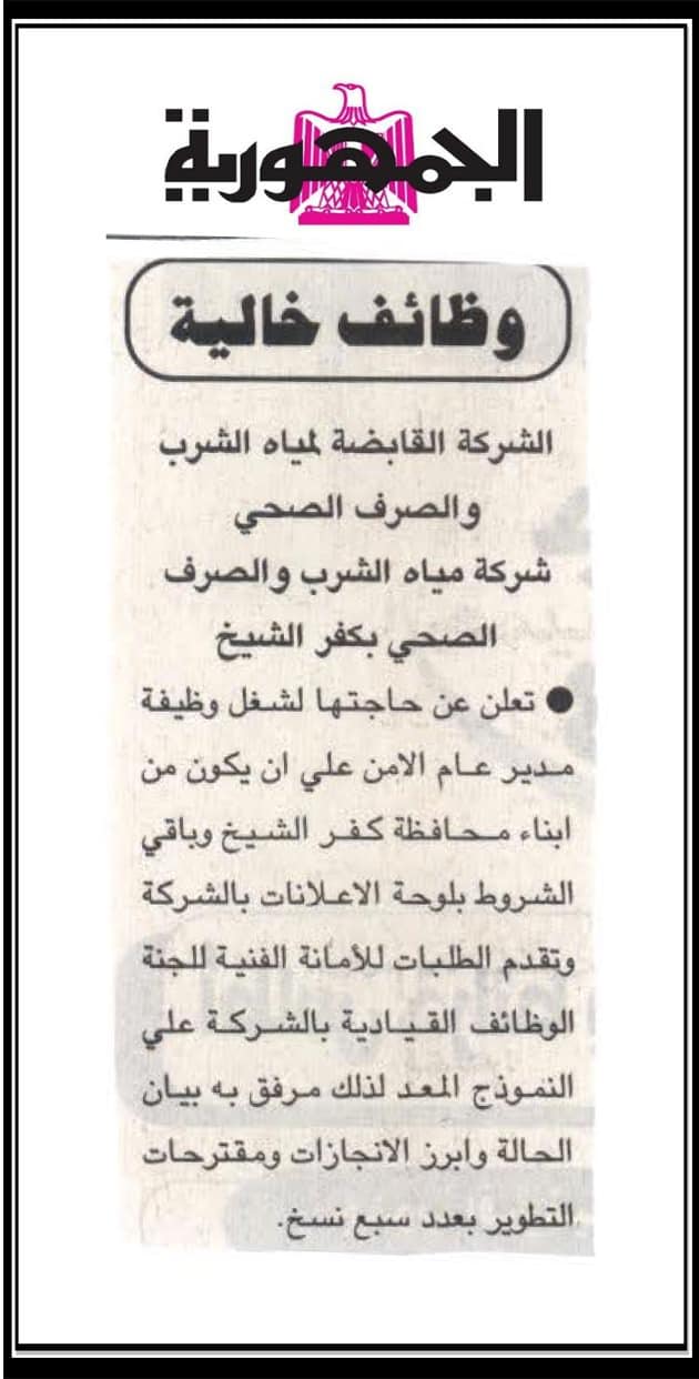 وظائف خاليه: شركة مياه الشرب والصرف الصحى بكفر الشيخ
