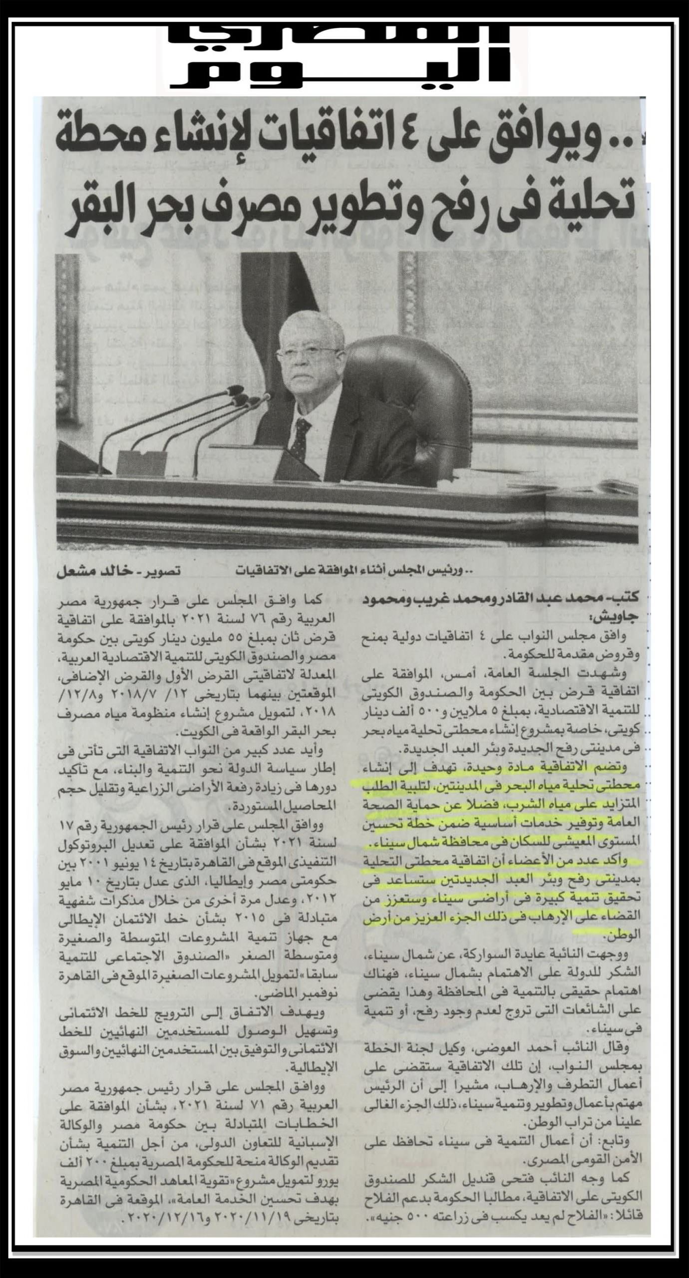 “ويوافق على 4 اتفاقيات لانشاء محطة تحلية في رفح وتطوير مصرف بحر البقر”