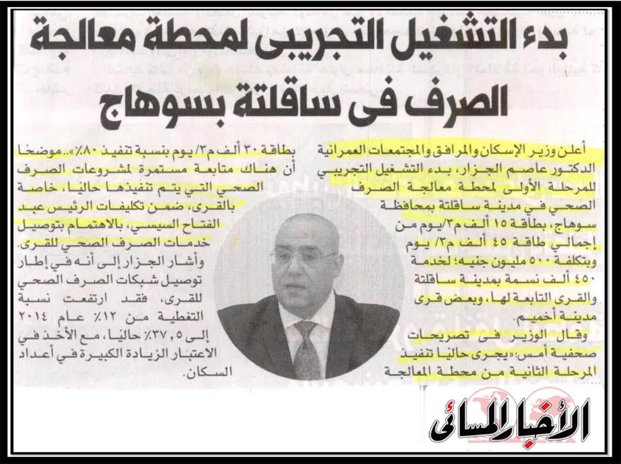 يدء التشغيل التجريبي لمحطة معالجة الصرف في ساقلتة بسوهاج .