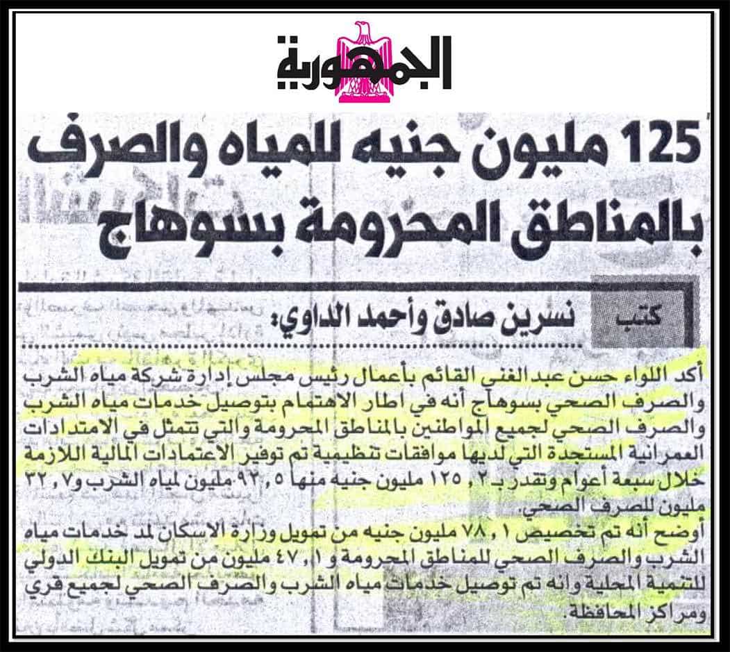 125مليون جنية للمياه والصرف بالمناطق المحرومة بسوهاج