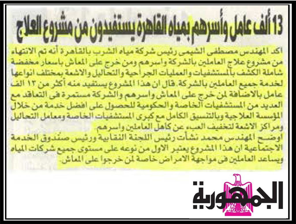 13 ألف عامل وأسرهم بمياه القاهرة يستفيدون من مشروع العلاج .