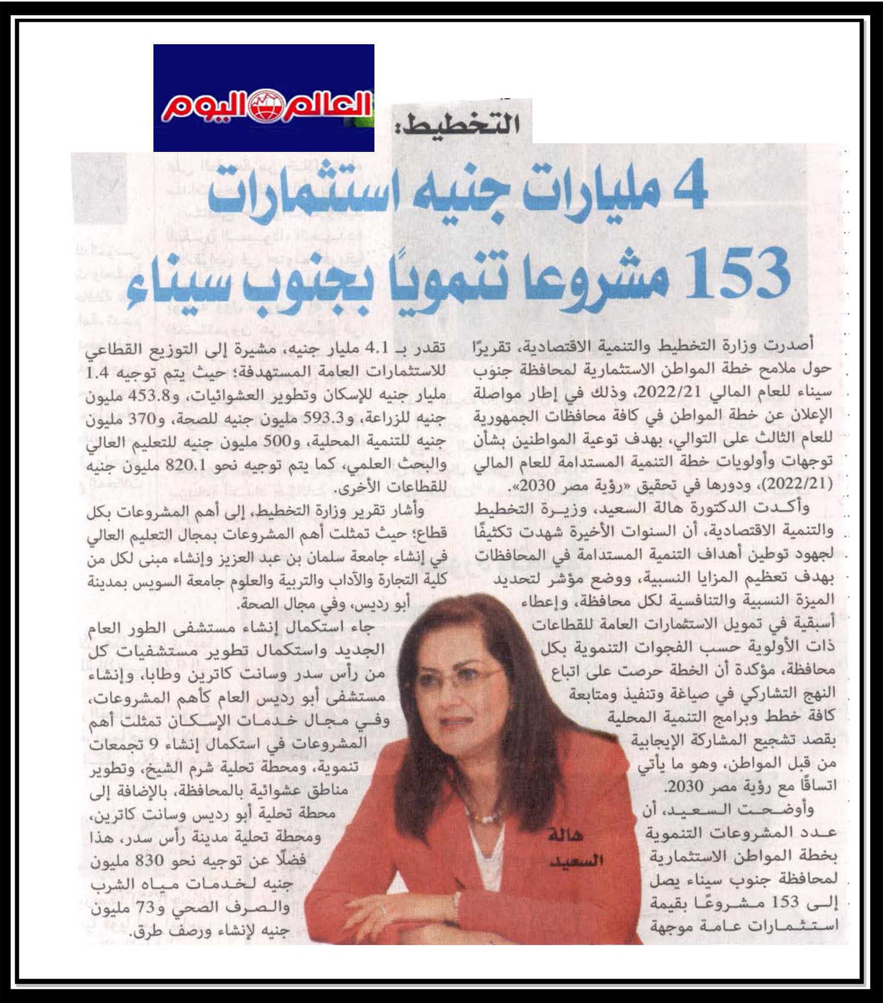 التخطيط: 4 مليارات جنية استثمارات 153 مشروعا تنمويا بجنوب سيناء .