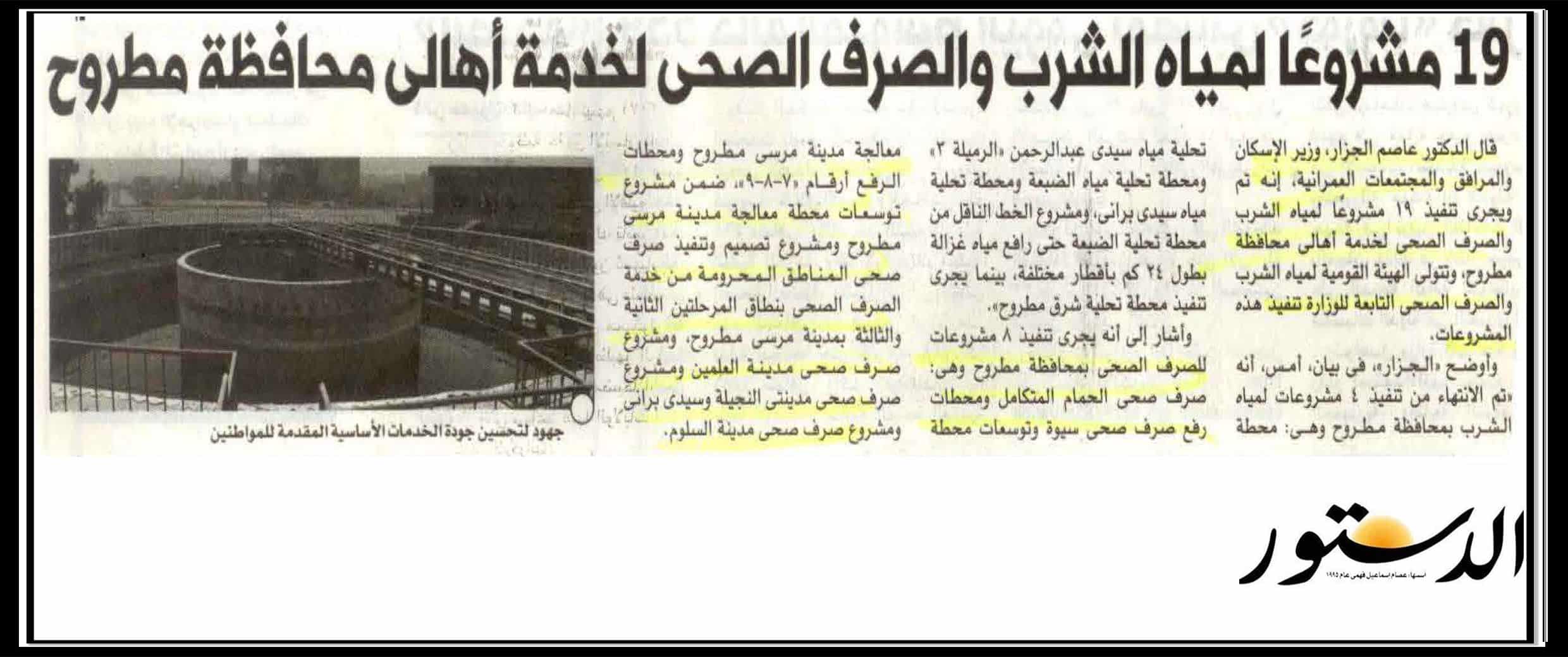 19 مشروعا لمياه الشرب والصرف الصحي لخدمة أهالي محافظة مطروح .