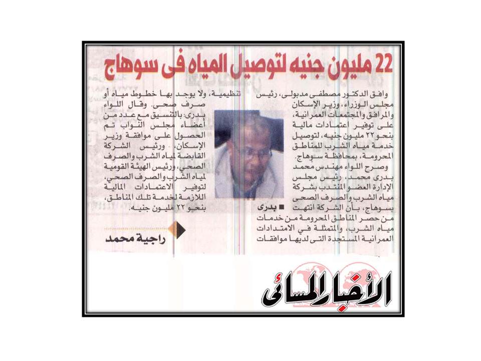 22 مليون جنية لتوصيل المياه لسوهاج .